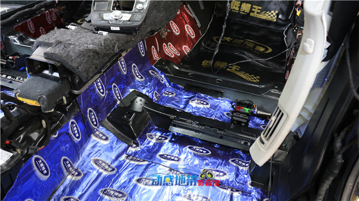 汽车噪音的很大一部分都是通过车地板传递进车内。尤其是低频噪音。这里我们先施工蓝金刚顶级隔音王给地板做个止震和强化钣金。这里使用的依然是满铺的方法,隔音效果和分块施工是一样的但是它的车身强化效果却非常的好。接下来是施工大能低频王。低频王这个材料是大能的专利产品独有5层结构。严格的来说它是大能唯一的隔音材料。顶级隔音王是止震材料。低频王的特殊结构可以有效的吸收和阻隔车地板传来得各种噪音。尤其是低频噪音这种有强大穿透力的噪音。
