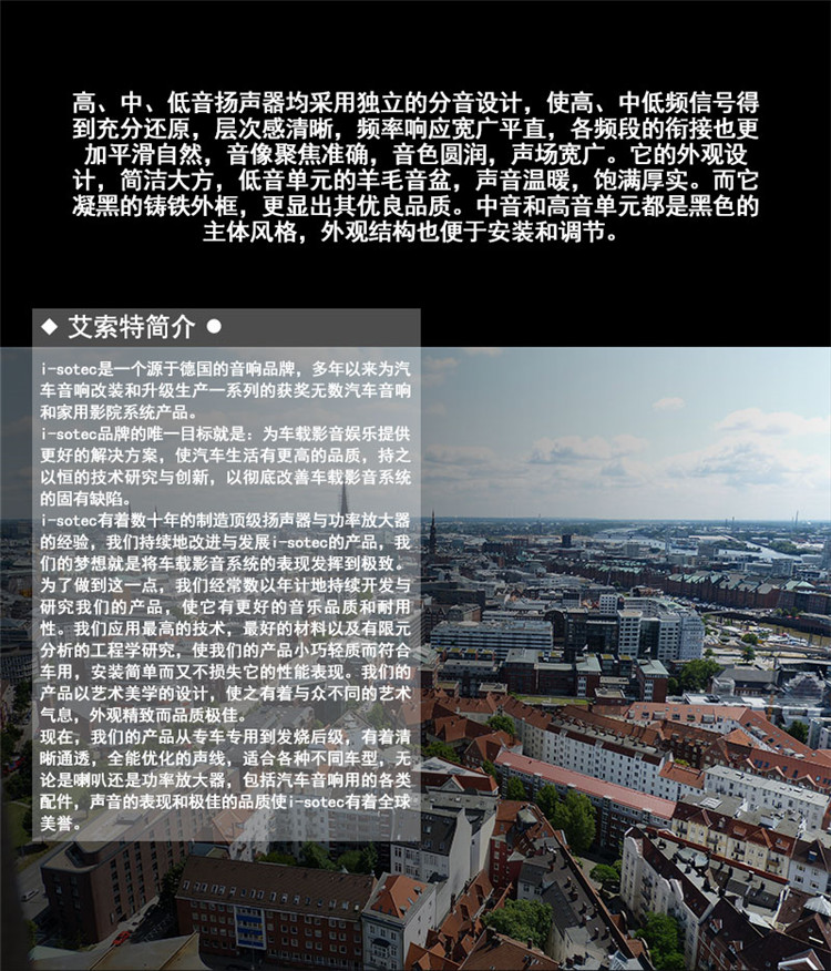 在汽车音响产品的测评中,如果从媒体的角度来思考,其实我们360汽车网一直在挖掘品牌的个性主张和品牌所追求的音响艺术性,从而让发烧车主与之一起共鸣。我们的做法是,考量音响学和汽车电子的新科技、新应用场景,产品的表现力和它的理念的契合度如何,来和大众分享这些专业级汽车音响产品。在汽车音响改装这个领域,也和家用或者便携式音响一样,也许我们容易被靓丽的外形所吸引,但对于老烧友们来说,音响产品要用耳朵来收货。最终烧友选择哪个类型的产品,讲音质、讲搭配还讲性价比;而今天介绍的德国i-sotec(艾索特)RE165.3,老烧友们为何会推荐TA呢?